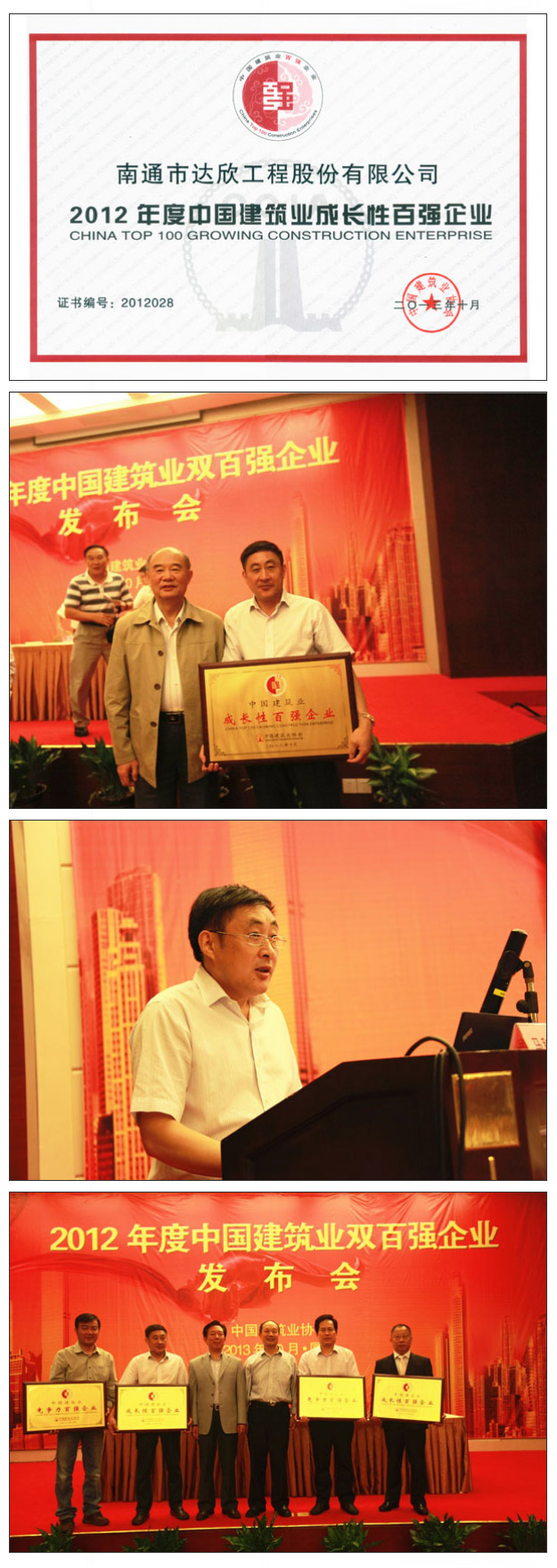 會議發(fā)布了2012年度中國建筑業(yè)雙百強企業(yè),南通市達欣工程股份有限公司再次入選成長性百強企業(yè)(綜合排名位列第28名,比去年排名提高了21位);會議向2012年度中國建筑業(yè)雙百強企業(yè)頒發(fā)牌證,我公司作為獲獎企業(yè)代表上臺領(lǐng)取獎牌;會議還同時進行了中國建筑業(yè)雙百強企業(yè)代表經(jīng)驗交流,公司董事長馬和軍作為江蘇地區(qū)代表、作為成長性百強企業(yè)代表在會上作了“砥礪奮進,拼搏進取,實現(xiàn)企業(yè)新跨越”的經(jīng)驗交流。