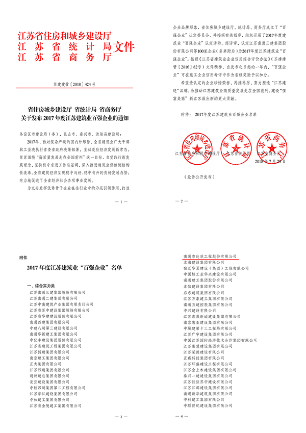 江蘇建筑業(yè)“百強企業(yè)”是由省建設廳、省統(tǒng)計局、省商務廳成立的“百強企業(yè)”認定委員會評議認定,從企業(yè)營業(yè)額等經(jīng)濟類指標、質量安全、技術創(chuàng)新指標等方面進行綜合評定,旨在充分發(fā)揮優(yōu)勢企業(yè)在全行業(yè)中的引領和示范作用,打造建筑企業(yè)品牌,提升核心競爭力,是權威性的政府評選。同時按照《江蘇省建筑業(yè)企業(yè)信用綜合評價辦法》(蘇建建管〔2016〕82號)文件精神,自發(fā)布之日起的一年內(nèi),“百強企業(yè)”可在施工企業(yè)信用考評中作為省級獎勵予以加分。