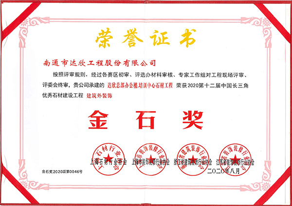 中國長三角石材建設(shè)工程“金石獎”是石材工程領(lǐng)域的奧斯卡金獎,達欣總部辦公樓培訓(xùn)中心獲此殊榮是對該項目完美品質(zhì)和公司實力的充分肯定。我們將以此為動力,繼續(xù)打造更多精品工程,為達欣的發(fā)展增光添彩。