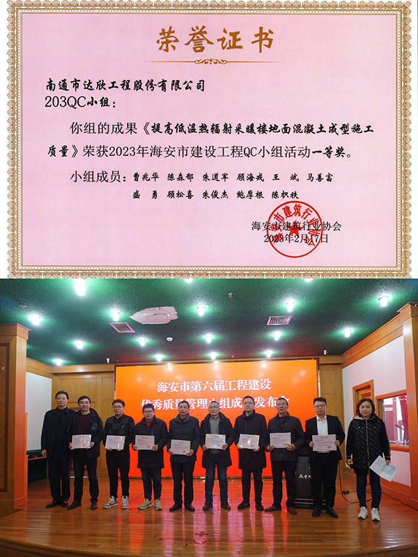 2月17日,海安市建筑業(yè)協(xié)會舉辦了海安市第六屆工程建設(shè)優(yōu)秀質(zhì)量管理小組成果發(fā)布會,集團選送的成果《提高低溫?zé)彷椛洳膳瘶堑孛婊炷脸尚褪┕べ|(zhì)量》榮獲一等獎。集團技術(shù)質(zhì)量部、BIM中心經(jīng)理王賽作為評委參與成果點評,集團技術(shù)質(zhì)量部、第二工程公司和第九工程公司相關(guān)技術(shù)人員參加活動。
