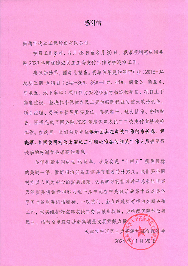 近日,第六工程公司承建的津?qū)帲⊕欤?018-04地塊項(xiàng)目三期工程代表天津市參加2023年度國(guó)家級(jí)省際交叉核查,在國(guó)務(wù)院針對(duì)省級(jí)根治欠薪工作整體情況的檢查中成績(jī)優(yōu)異,榮獲“標(biāo)桿項(xiàng)目”榮譽(yù)稱號(hào),并對(duì)迎檢過(guò)程中全體工作人員真抓實(shí)干、通力協(xié)作的精神表示感謝。