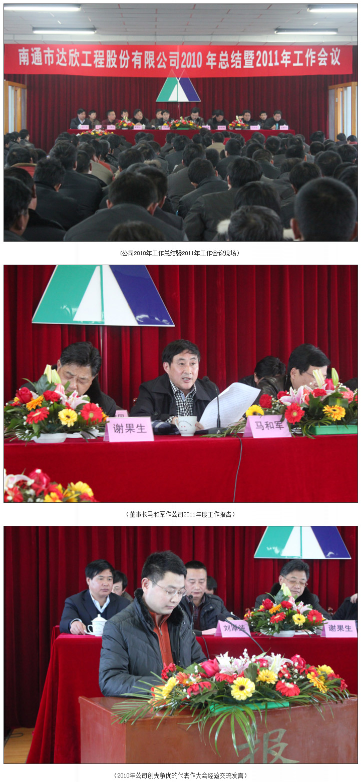 會(huì)議首先由公司董事長馬和軍同志作了題為“砥礪奮進(jìn),繼往開來,二次創(chuàng)業(yè),為實(shí)現(xiàn)達(dá)欣又好又快地發(fā)展而努力奮斗”的 2010年總結(jié)暨2011年工作動(dòng)員報(bào)告。報(bào)告中肯定了過去的一年是達(dá)欣穩(wěn)步發(fā)展的一年,也是達(dá)欣人奮發(fā)有為、積極向上的一年,這一年企業(yè)的美譽(yù)度有了新的提升,企業(yè)的創(chuàng)優(yōu)創(chuàng)新再結(jié)新碩果,企業(yè)的內(nèi)控管理建設(shè)再有新突破;同時(shí)報(bào)告中也著重指出影響企業(yè)持續(xù)健康發(fā)展的一些突出矛盾和問題,報(bào)告最后明確了2011年公司的奮斗目標(biāo)與方向,號(hào)召全體達(dá)欣人,要以更加務(wù)實(shí)的精神,更加豪邁的熱情,團(tuán)結(jié)一心,抓住機(jī)遇搶主動(dòng),用好機(jī)遇贏未來,力爭新的一年再有新飛躍,以優(yōu)異的成績向黨的九十周年獻(xiàn)禮!