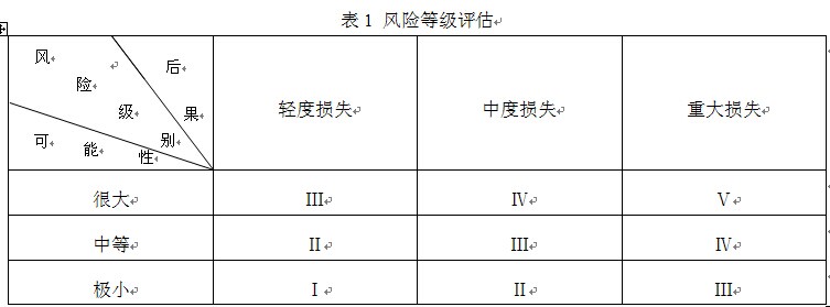 在對(duì)危險(xiǎn)源識(shí)別的基礎(chǔ)上,評(píng)估危險(xiǎn)源造成風(fēng)險(xiǎn)可能性和大小,對(duì)風(fēng)險(xiǎn)進(jìn)行分級(jí),對(duì)不同等級(jí)風(fēng)險(xiǎn)采用相應(yīng)的風(fēng)險(xiǎn)控制措施。風(fēng)險(xiǎn)等級(jí)評(píng)估:Ⅰ級(jí)為可忽略風(fēng)險(xiǎn);Ⅱ級(jí)為可接受風(fēng)險(xiǎn);Ⅲ級(jí)為中度風(fēng)險(xiǎn);Ⅳ級(jí)為重大風(fēng)險(xiǎn);Ⅴ級(jí)為不容許風(fēng)險(xiǎn),如表1。