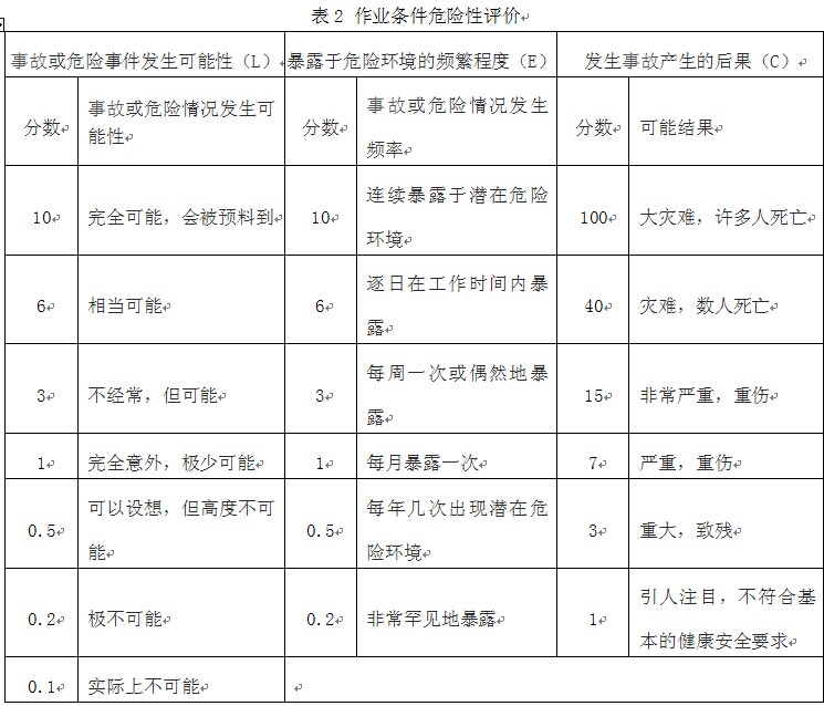 表2 作業(yè)條件危險(xiǎn)性評(píng)價(jià)