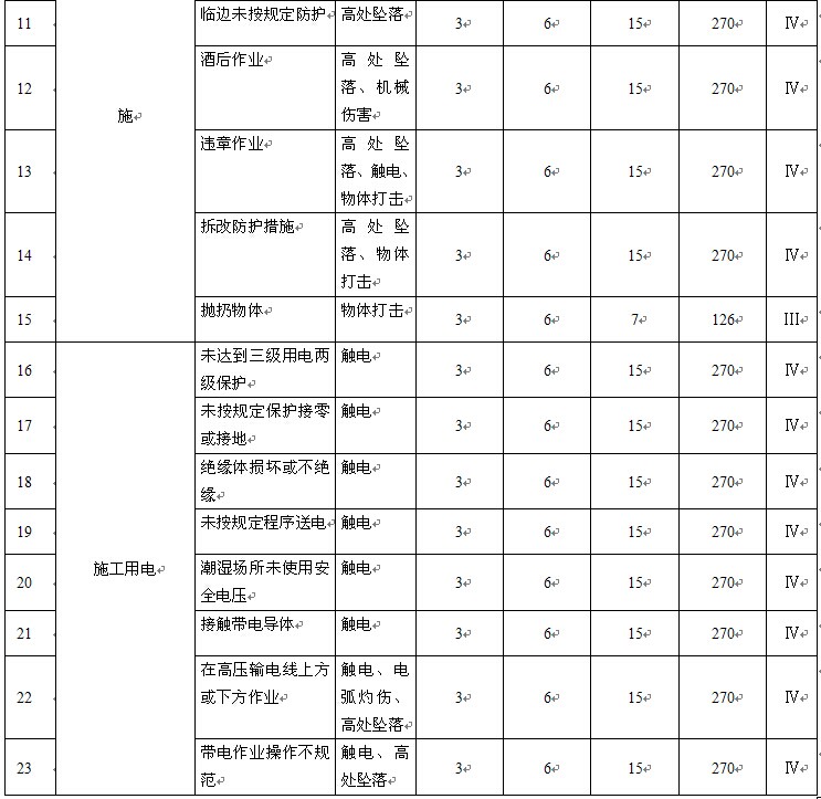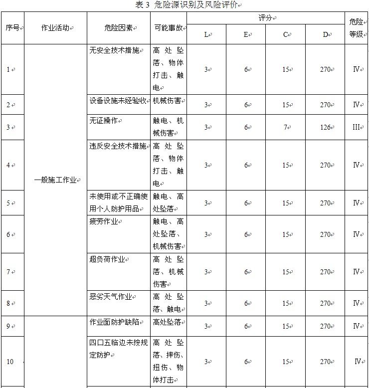 本公司目前在建的主要工程有:重慶直升機(jī)投資有限公司項(xiàng)目(包括總裝廠房、交付中心和教學(xué)大樓),重慶機(jī)床集團(tuán)搬遷項(xiàng)目(包括廠房、科技大樓、倒班宿舍)。公司針對(duì)兩個(gè)施工現(xiàn)場(chǎng)特點(diǎn)進(jìn)行分析,制訂了危險(xiǎn)源識(shí)別及風(fēng)險(xiǎn)評(píng)價(jià)表,部分內(nèi)容如表3。