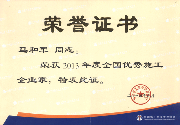 中國施工企業(yè)管理協(xié)會(huì)于今年2月發(fā)出召開“2014年全國施工企業(yè)領(lǐng)軍人物峰會(huì)”的通知,根據(jù)通知要求,嚴(yán)格按照“全國優(yōu)秀施工企業(yè)家”條件在全國范圍內(nèi)優(yōu)選參會(huì)代表。經(jīng)申請(qǐng)、推薦、審核、公示,中國施工企業(yè)管理協(xié)會(huì)企業(yè)家工作委員會(huì)審定,確定166位企業(yè)領(lǐng)導(dǎo)為“2014年全國施工企業(yè)領(lǐng)軍人物峰會(huì)”參會(huì)人選并授予“全國優(yōu)秀施工企業(yè)家”榮譽(yù)稱號(hào)。公司董事長馬和軍榮列榜單之中。