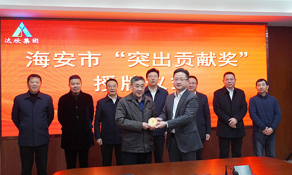12月1日,海安高新區(qū)黨工委書記鄧加忠,黨工委副書記、管委會主任魯斌,黨工委副書記、科創(chuàng)園主任陸建銀,管委會副主任徐愛軍等領(lǐng)導(dǎo),為企業(yè)“2021年度入庫稅金超億元”,舉行“突出貢獻(xiàn)獎”授牌儀式。這是繼去年集團(tuán)榮獲此項獎牌后,再次受到當(dāng)?shù)卣挠忠淮渭为劰膭?。集團(tuán)領(lǐng)導(dǎo)馬和軍、劉厚純等出席授牌儀式。